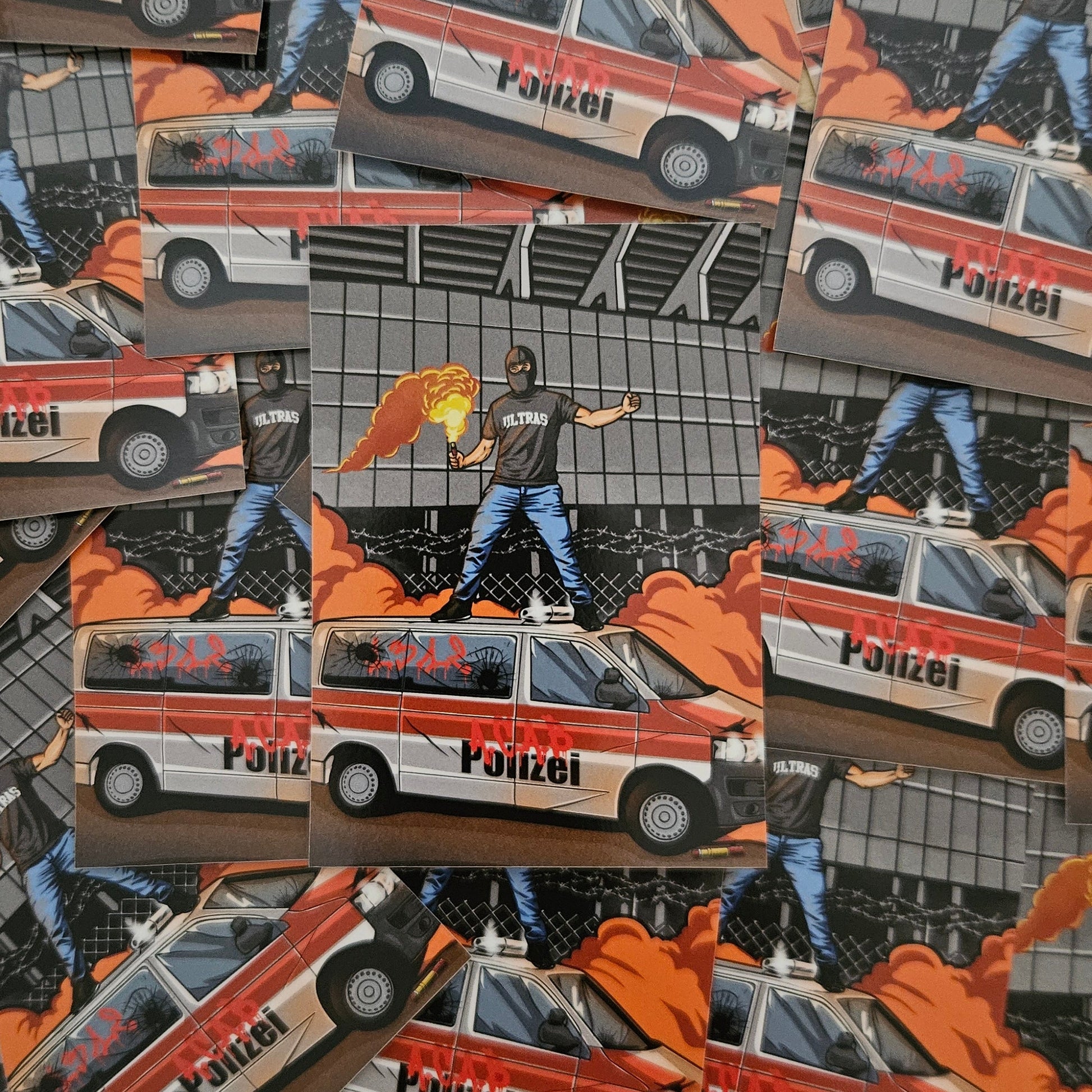Dieser Sticker greift die raue Bildsprache der Ultra- und Street-Art-Szene auf. Das Motiv zeigt eine zugespitzte, provokante Szene, wie sie seit Jahrzehnten als symbolische Kritik an Repression, Überwachung und Machtdynamiken rund um den Fussball genutzt wird.